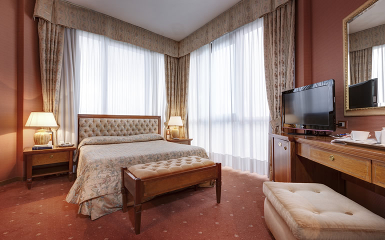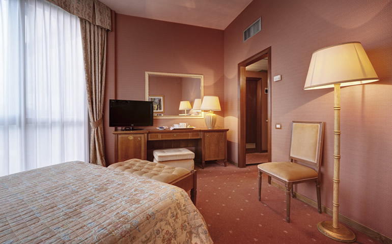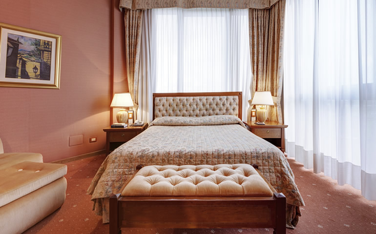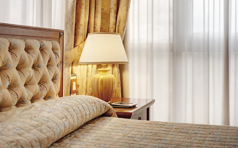 Queste camere hanno complementi d'arredo in stile classico, dal colore albicocca, con tende damascate coordinate e morbidi copriletto a righe che aggiungono un tocco di raffinatezza.