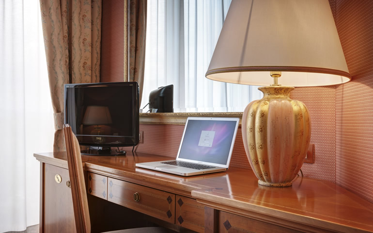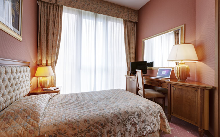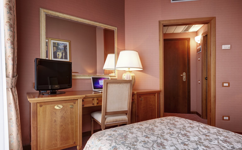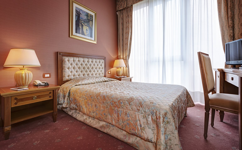 Queste camere sono arredate in stile classico, con pareti di un caldo color arancio, in scala con il colore pastello dei tendaggi damascati e dei copriletto.
