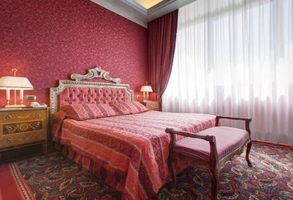 Questa suite é arredata in uno stile sontuoso dal colore rosso impero, con un'elegante area soggiorno dai mobili in legno altamente figurato, sedie imbottite e tavolo da pranzo. Uno specchio ornamentale a figura intera dona il tocco finale. La suite dispone di stanza-guardarobe.