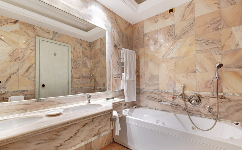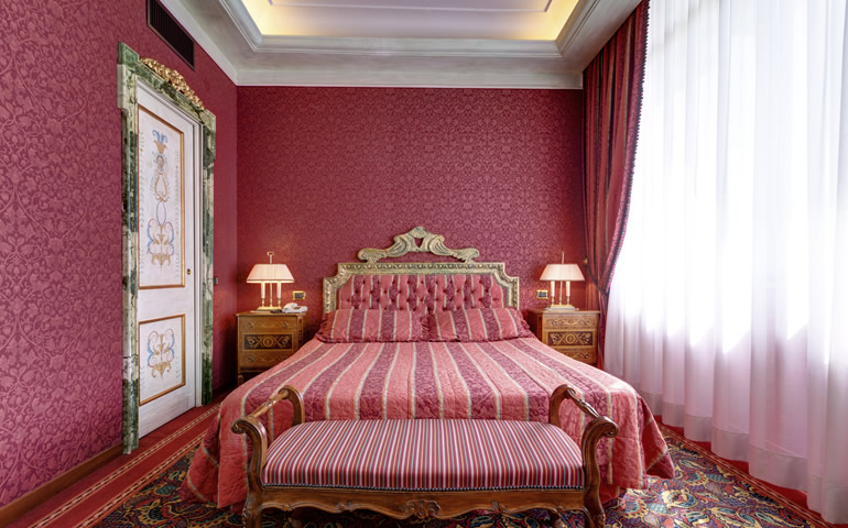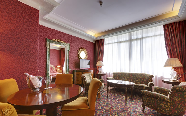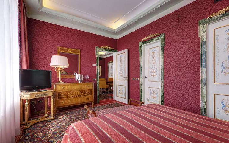 Questa suite é arredata in uno stile sontuoso dal colore rosso impero, con un'elegante area soggiorno dai mobili in legno altamente figurato, sedie imbottite e tavolo da pranzo. Uno specchio ornamentale a figura intera dona il tocco finale. La suite dispone di stanza-guardarobe.